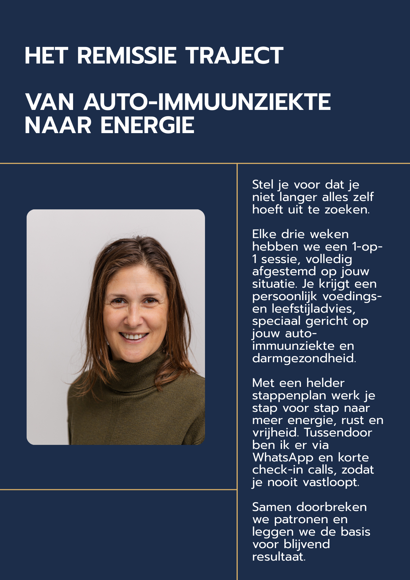 Voel jij je uitgeput door je auto-immuunziekte of hormoonklachten? Ons 100 dagen programma of 1-op-1 Remissie Traject helpt je in 100 dagen of 6 maanden de grip terug te krijgen op je lichaam: